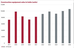 Among the higher volume equipment types in the Indian market, the biggest increases in sales were for crawler excavators, mobile cranes and wheeled loaders. Much against the overall market trend, backhoe loader sales fell 2 per cent last year, but with more than 37,000 machines sold, this segment was still the largest in the industry, accounting for 45 per cent of sales in unit terms.