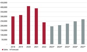 The market is forecast to continue to fall in 2023, but at a slower decline of about 18 per cent, to settle at just below 195,000 units. Domestic demand may flatten out during 2024-2025, and the recovery will be very slow. A real recovery is expected during the period of the 15th Five Year Plan (2026-2030), primarily as a result of increased sales of compact equipment and the returning replacement demand; by then the market may return to 270,000-300,000 units, but even that volume is still very much lower than what has been seen in the recent past.
